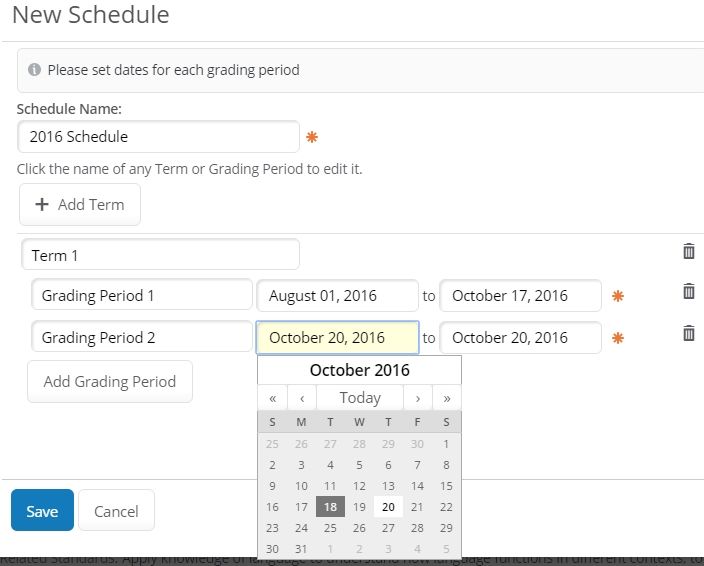 These restrictions do not apply to availability dates which can be set to overlap a grading period. In the set name field. Administrators can set up as many as twelve grading periods and name them whatever is most meaningful for your school s record keeping. The term type is selected based on calpads.